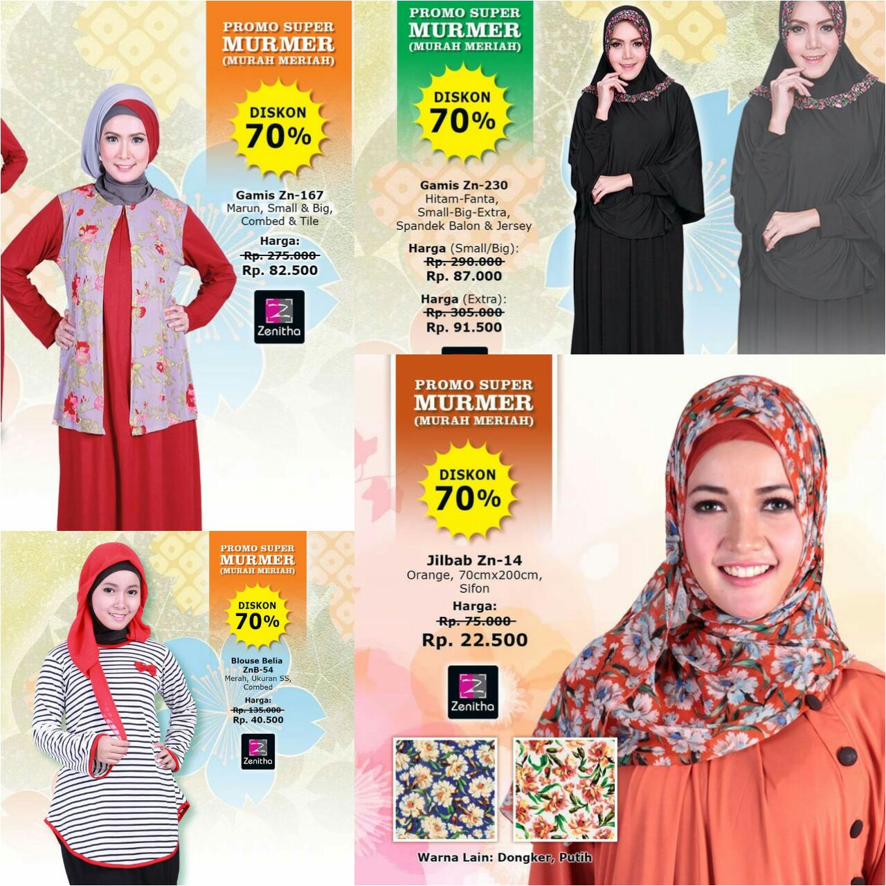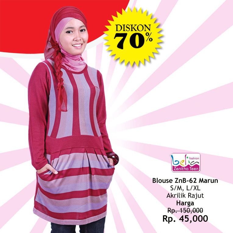 Koleksi Busana branded Zenitha kembali memberikan diskon spesial super CLEARENCE SALE 70 % tanpa syarat. Untuk anda yang ingin menambah koleksi maupun menambah produk usaha, segera manfaatkan kesempatan dengan melakukan pemesanan ke customer service kami. Stok Edisi promo 70% Zenitha sangat terbatas, so segera lakukan pemesanan sekarang juga.