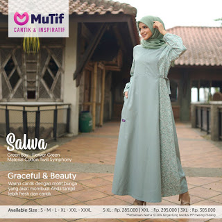Koleksi Gamis Mutif Terbaru Gamis Salwa melengkapi koleksi gamis syar'i anda. Dengan desain yang simple sangat cocok untuk kegiatan sehari-hari, selain itu gamis model terbaru ini sangat nyaman untuk menemani aktifitas anda karena terbuat dari bahan yang terjamin kualitasnya.
